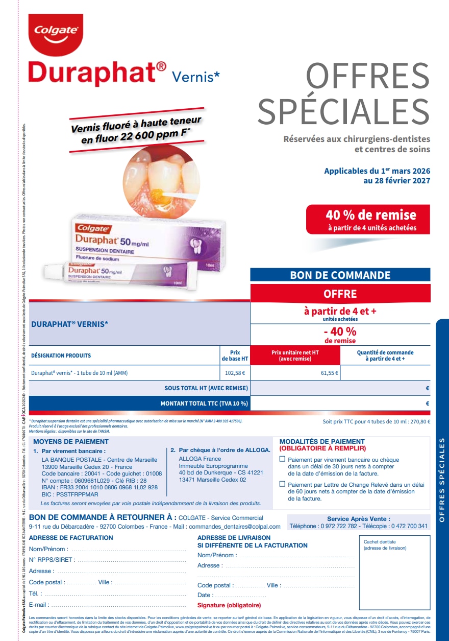 Vous trouverez ci-dessous le bon de commande à télécharger pour nous l'envoyer avec votre règlement par email : commandes_dentaires@colpal.com ou par voie postale : COLGATE - Service commercial 9 - 11 rue du Débarcadère - 92700 Colombes - France